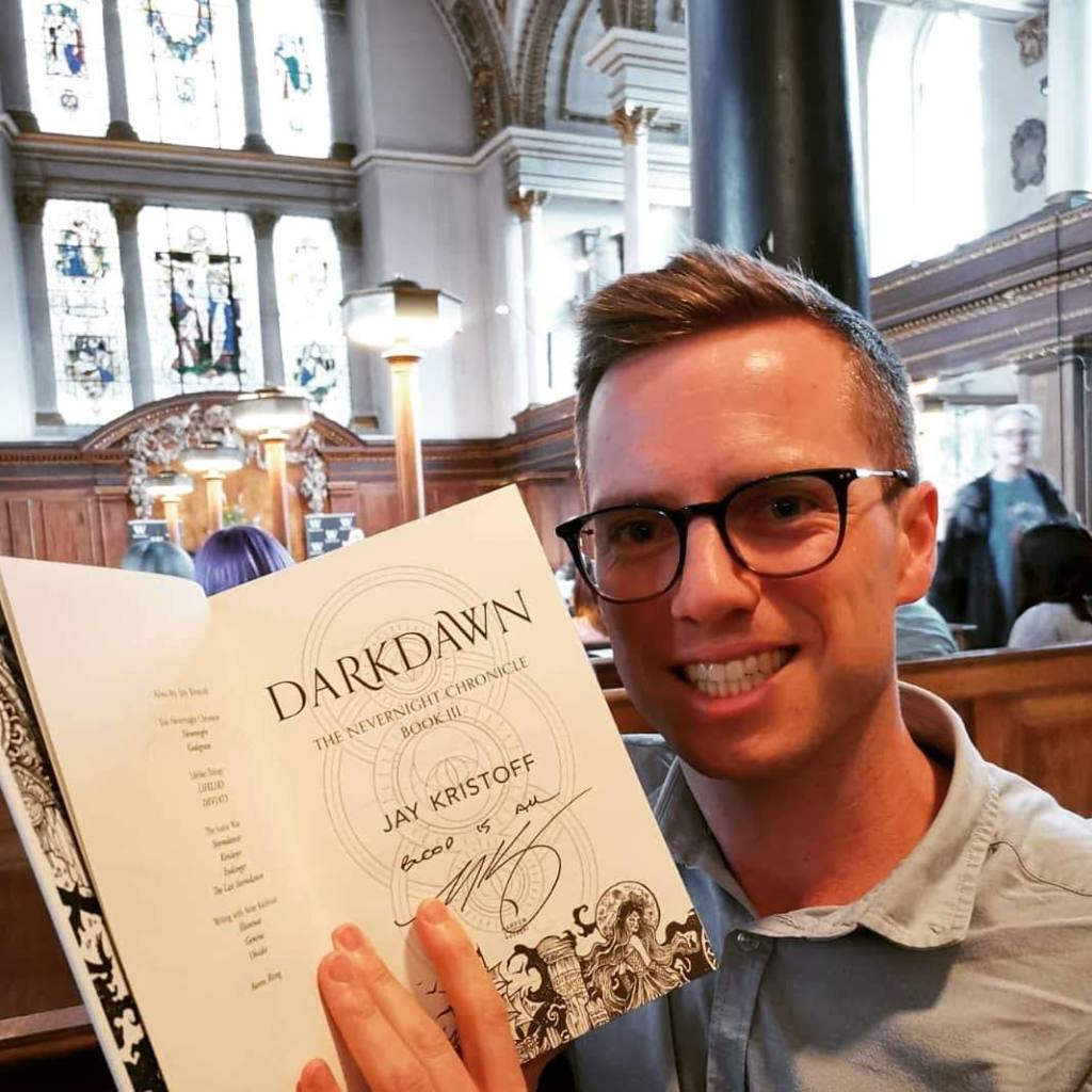 Mia’s tale is told over three books: Nevernight, Godsgrave and Darkdawn. The books are ruthless, gripping, hilarious, shocking, heart-warming, and infuriating. Would recommend. It has assassins, amusing footnotes, gladiators, smut, pirates, terrific one-liners, gays, treachery, a fully-fledged mythology, and all the rest – what more could you want, gentlefriend? I’ve just finished the final book; here’s my copy (signed!) which I picked up at an author talk Jay Kristoff held in London at St James Piccadilly – a 17th century church which provided the perfect atmosphere.