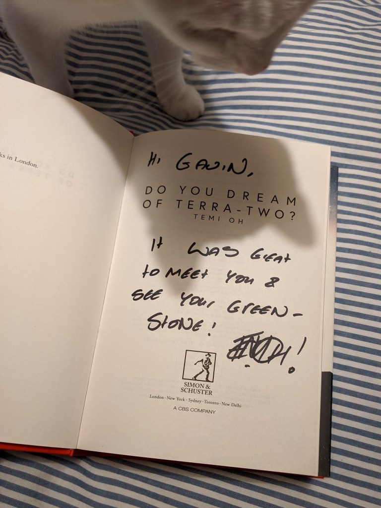 Earlier last year I attended a Waterstones ‘Titans of Sci-Fi’ event, hosted by Pat Cadigan at Waterstones Piccadilly, London. The authors were promoting their latest novels: Alastair Reynolds with Shadow Captain, the second in his Revenger series (covered in a previous blog post); Emma Newman with Atlas Alone, the fourth in her Planetfall series; and Temi Oh with her debut novel Do You Dream of Terra-Two?