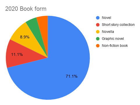 - Novels were still the dominant form of book, followed by short story collections which I fell in love with in 2020.