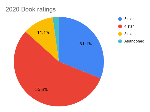 RATING: I finished 45 books in 2020, and as per last year I really enjoyed most of them. This is represented by ★★★★★ or ★★★★☆ ratings, with 11% at a more moderate ★★★☆☆, and only one book being abandoned part way through. Again, I wonder if I’m being too safe with my picks? Too generous with my ratings? Or does my routine of checking reviews before starting on Chapter 1 mean I avoid anything I really won’t like?
