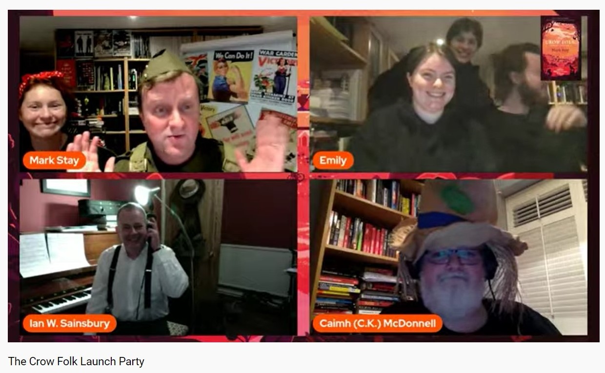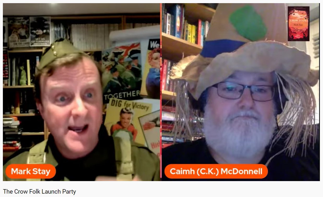 I attended the online book launch party, presented by author Mark Stay, with comedian and author Caimh McDonnell acting as Master of Ceremonies. The dress code for the event was 1940s Home Front, but Caimh did as he pleased and came dressed as the book’s villain. One of the many joys of watching the livestream was seeing Caimh’s struggle with his scarecrow hat as it went everywhere but the top of his head.