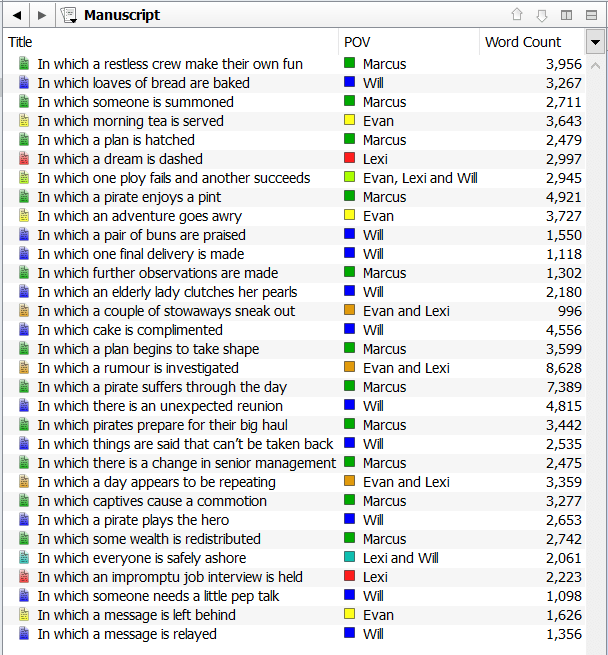 My novel’s second draft comprised the story edit (AKA developmental or structural edit). I’ve previously jotted down my editing process for Over and Out, my third novella, and I followed a similar process for The Pirate and the Baker. Again, I didn’t make any wholesale plot changes, because I had the story mostly outlined before I started. Still, I made some other significant changes at this stage: