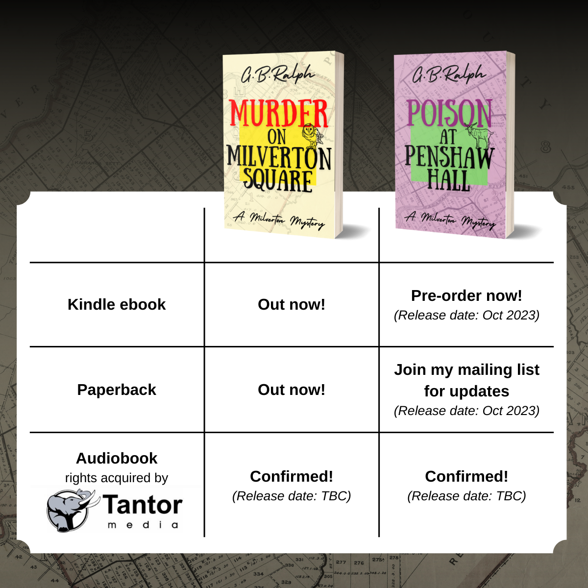 Audiobook release dates are still to be confirmed, but if you jump on my mailing list then I’ll be sure to let you know the moment I find out! For now, Murder on Milverton Square is of course already available in ebook and paperback formats, and Poison at Penshaw Hall is available for pre-order in ebook format, with paperbacks available from late October.