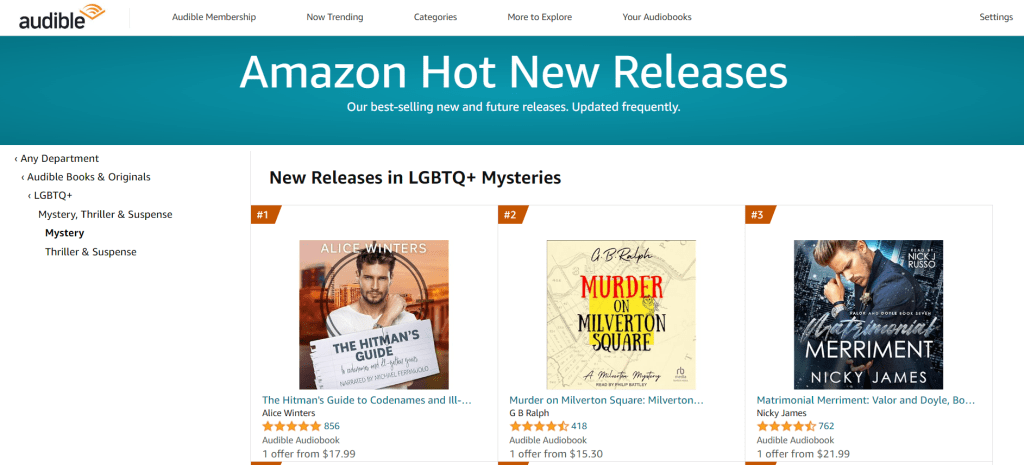 Or check out Amazon.com’s Hot New Releases in LGBTQ+ Mysteries audiobooks chart for yourself (they’re updating all the time, so rankings regularly shift about).