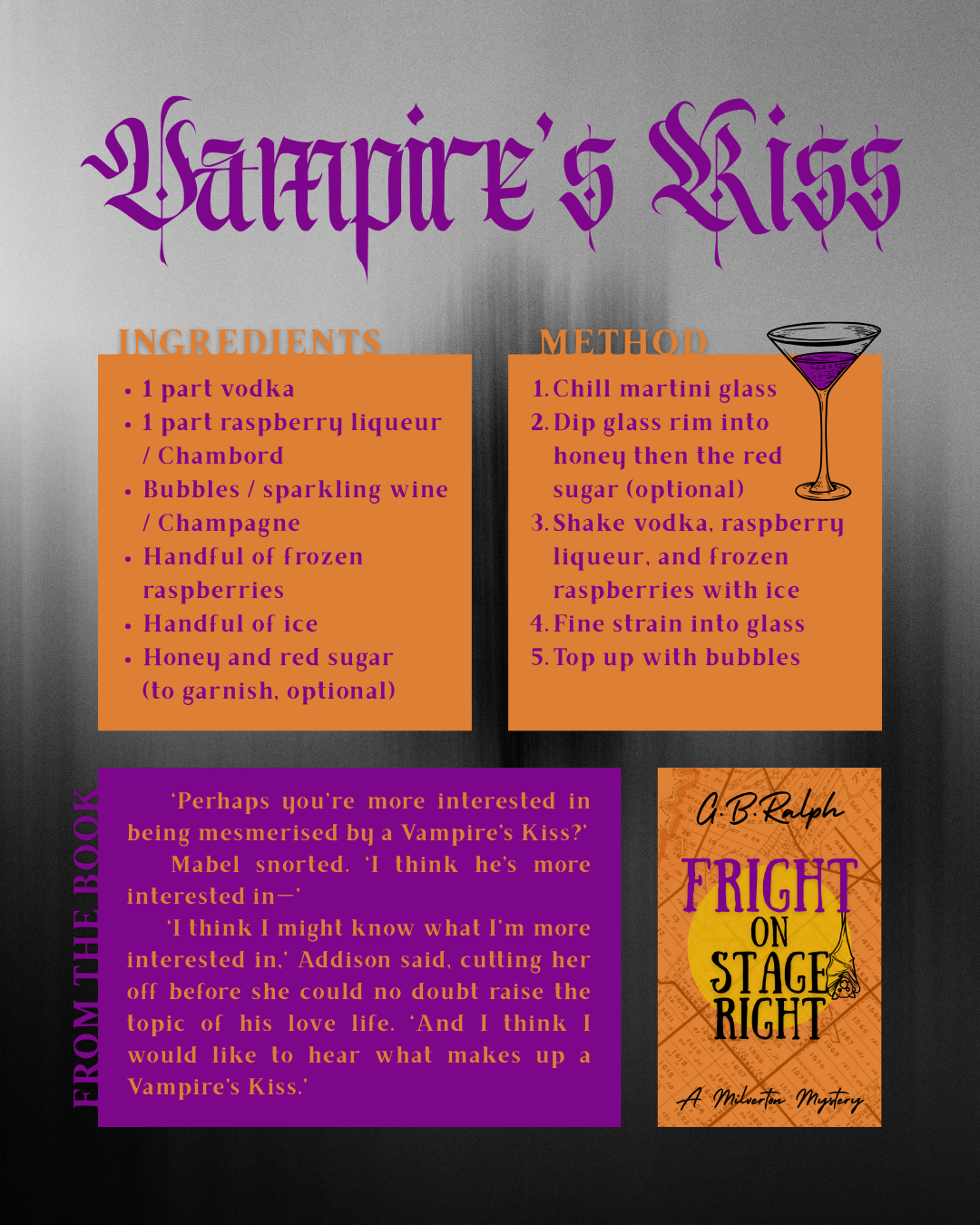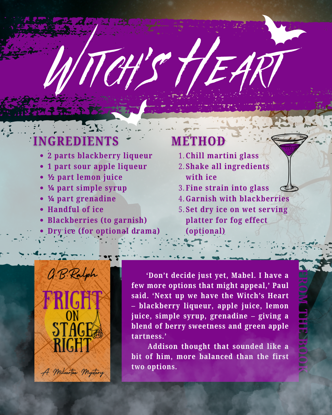 Paul Stewart, owner and head distiller of the Milverton Distilling Company, presented Addison and Mabel a few options at the Halloween night market in Fright on Stage Right. I have collected recipes together for you to try for yourself!